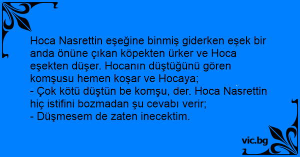 - Çok kötü düştün be komşu, der. Hoca Nasrettin hiç istifini bozmadan şu cevabı verir;
