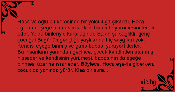 Hoca ve oğlu bir keresinde bir yolculuğa çıkarlar. Hoca oğlunun eşeğe binmesini ve kendisininde yürümesini tercih eder. Yolda birileriyle karşılaşırlar,-Bakın şu sağlıklı, genç çocuğa! Bugünün gençliği. yaşlılarına hiç saygıları yok. Kendisi eşeğe binmiş ve garip babası yürüyor! derler.