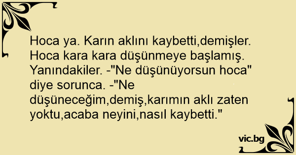 Hoca ya. Karın aklını kaybetti,demişler. Hoca kara kara düşünmeye başlamış. Yanındakiler. -"Ne düşünüyorsun hoca" diye sorunca. -"Ne düşüneceğim,demiş,karımın aklı zaten yoktu,acaba neyini,nasıl kaybetti."