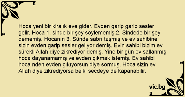 Hoca yeni bir kiralık eve gider. Evden garip garip sesler gelir. Hoca 1. sinde bir şey söylememiş.2. Sindede bir şey dememiş. Hocanın 3. Sünde sabrı taşmış ve ev sahibine sizin evden garip sesler geliyor demiş. Evin sahibi bizim ev sürekli Allah diye zikrediyor demiş. Yine bir gün ev sallanmış hoca dayanamamış ve evden çıkmak istemiş. Ev sahibi hoca nden evden çıkıyorsun diye sormuş. Hoca sizin ev Allah diye zikrediyorsa belki secdeye de kapanabilir.