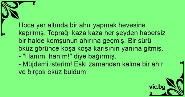 Hoca yer altında bir ahır yapmak hevesine kapılmış. Toprağı kaza kaza her şeyden habersiz bir halde komşunun ahırına geçmiş. Bir sürü öküz görünce koşa koşa karısının yanına gitmiş.