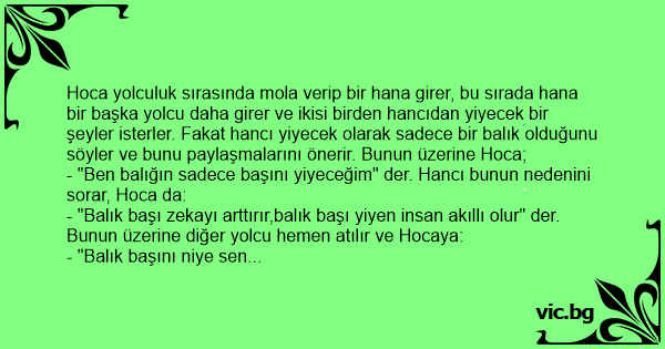 - "Ben balığın sadece başını yiyeceğim" der. Hancı bunun nedenini sorar, Hoca da: