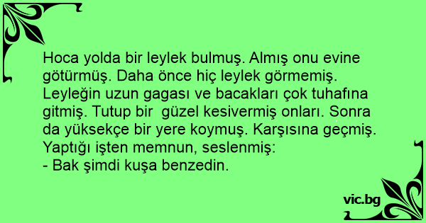 Hoca yolda bir leylek bulmuş. Almış onu evine götürmüş. Daha önce hiç leylek görmemiş. Leyleğin uzun gagası ve bacakları çok tuhafına gitmiş. Tutup bir güzel kesivermiş onları. Sonra da yüksekçe bir yere koymuş. Karşısına geçmiş. Yaptığı işten memnun, seslenmiş: