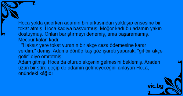 - "Haksız yere tokat vuranın bir akçe ceza ödemesine karar verdim." demiş. Adama dönüp kaş göz işareti yaparak, "giт bir akçe getir" diye emretmiş.