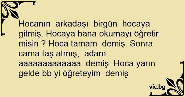 Hocanın arkadaşı birgün hocaya gitmiş. Hocaya bana okumayı öğretir misin ? Hoca tamam demiş. Sonra cama taş atmış, adam aaaaaaaaaaaaa demiş. Hoca yarın gelde bb yi öğreteyim demiş