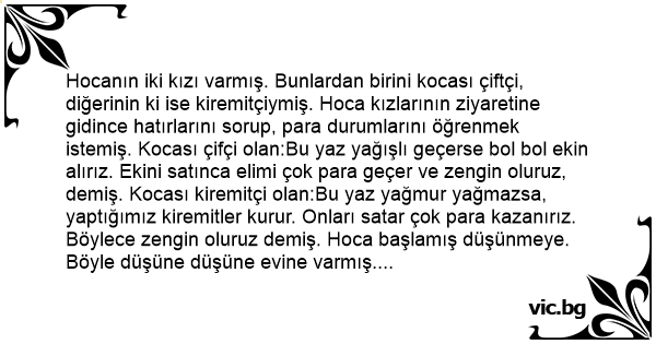 Hocanın iki kızı varmış. Bunlardan birini kocası çiftçi, diğerinin ki ise kiremitçiymiş. Hoca kızlarının ziyaretine gidince hatırlarını sorup, para durumlarını öğrenmek istemiş. Kocası çifçi olan:Bu yaz yağışlı geçerse bol bol ekin alırız. Ekini satınca elimi çok para geçer ve zengin oluruz, demiş. Kocası kiremitçi olan:Bu yaz yağmur yağmazsa, yaptığımız kiremitler kurur. Onları satar çok para kazanırız. Böylece zengin oluruz demiş. Hoca başlamış düşünmeye. Böyle düşüne düşüne evine varmış.