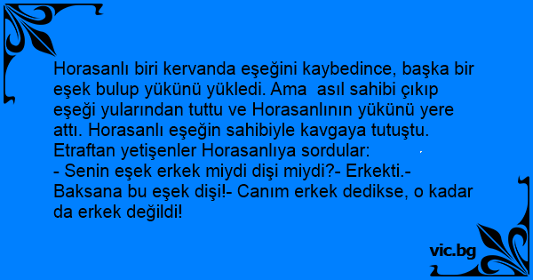 - Senin eşek erkek miydi dişi miydi?- Erkekti.- Baksana bu eşek dişi!- Canım erkek dedikse, o kadar da erkek değildi!