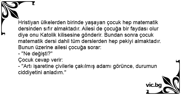 Hristiyan ülkelerden birinde yaşayan çocuk hep matematik dersinden sıfır almaktadır. Ailesi de çocuğa bir faydası olur diye onu Katolik kilisesine gönderir. Bundan sonra çocuk matematik dersi dahil tüm derslerden hep pekiyi almaktadır. Bunun üzerine ailesi çocuğa sorar: