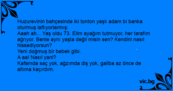 Huzurevinin bahçesinde iki tonton yaşlı adam bi banka oturmuş laflıyorlarmış: