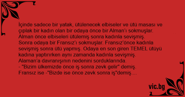 Fransız ise -"Bizde ise önce zevk sonra iş"demiş.
