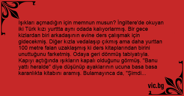 Işıkları açmadığın için memnun musun? İngiltere'de okuyan iki Türk kızı yurttta aynı odada kalıyorlarmış. Bir gece kizlardan biri arkadaşının evine ders çalışmak için gidecekmiş. Diğer kızla vedalaşıp çıkmış ama daha yurttan 100 metre falan uzaklaşmış ki ders kitaplarından birini unuttuğunu farketmiş. Odaya geri dönmüş tabiyatıyla. Kapıyı açtığında ışıkların kapalı olduğunu görmüş. "Banu yattı heralde" diye düşünüp ayaklarının ucuna basa basa karanlıkta kitabını aramış. Bulamayınca da, "Şimdi kızcağızı rahatsız etmeyim, nasılsa arkadaşımda aynı kitaptan var. İdare ederiz artık" deyip çıkıp gitmiş. Ertesi sabah sınavdan sonra odasına döndüğünde bir de ne görsün! Oda baştan aşağı kan içinde! Arkadaşının vücudu da parçalar halinde oraya buraya dağıtılmış. Duvarda da (muhTemel'en kızın kanıyla yazılmış) bir yazı varmış: