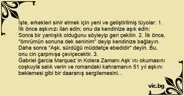 Ğabriel ğarcia Marquez`in Kolera Zamanı Aşk`ını okumasını coşkuyla salık verin ve romandaki kahramanın 51 yıl aşkını beklemesi gibi bir daaranış sergilemesini ondan da umduğunuzu ima edin. 4. Kontrolün kimde olduğunu göstermek için, onun telefonlarına ve e - posta mesajlarına - verecekseniz bile - hep geç cevap verin. 5. Telefon ettiğinizde de, kendinizi odadaki kişiyle konuşmayı kesmek zorunda hissetmeyin. Bırakın, telefondaki erkek arkadaşınız beklesin ve konuşmanızın yalnızca sizin tarafını dinlemek zorunda kalsın. 6. `Yanlışlıkla` özel notlarını okuyun, sonra hesap sorun. 7. Eski erkek arkadaşınıza iletmeniz gereken bir mesajı yanlışlıkla onun telesekreterine bırakın. 8. Evini ziyaret ettiğinizde telefon çalarsa, suçlar bir biçimde " Hmm, bu da kim olabilir?" diye dudak bükün. 9. Arandevulara 15 dakika geç gitmeyi adet haline getirin. Bir gün, haklı sebepten de olsa geç kaldığında küplere binin. 10. Hattaarandevulara hiç gitmeyin. Sözlerinizin hiç birini tutmayın. 11. Sizi kentin en pahalı restaranlarından birine götürmesini sağlayın; yemek gelince de yüksek sesle porsiyonların küçüklüğünden yakının. Ya da kıtlıktan çıkmış gibi yiyin. 12. Evinizin en göze çarpan köşesine eski erkek arkadaşınızın çerçeveli resmini asın. 13. Yatak yapmayı, ütülemeyi, yemek pişirmeyi, temizlik yapmayı bilmemezlikten gelin. 14. İlk öpüştüğünüzde dilinizi boğazına kadar sokun. 15. İzinizi bırakın: boynunun görülebilecek bir yerini İsırın. 16. O evinden bir başka yere taşınırken, münasip bir biçimde tatile çıkın. 17. Bir başka erkek arkadaşınız olduğunu söylemeyi unutuvermiş olun. 18. Onu iş yerinde ziyarete gittiğinizde, amiri ya da daha iyisi memuru ile kesişin. 19. Arkadaşlarının yanında küçük düşürün. 20. Annesini eleştirin. Ebeveynini ziyerete gittiğinizde, onun hiç sevmediği elbisenizi bilhassa giyin. En yakın akrabalarının, kardeşinin falan adını unutun. 21. Sözüm ona size hediye aldığı ütü, ekmek kızartma makinesi, mikser gibi ev eşyalarını yılbaşında annesine hediye edin. 22.