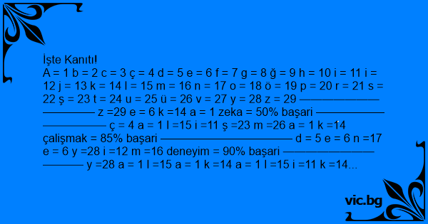 A = 1 b = 2 c = 3 ç = 4 d = 5 e = 6 f = 7 g = 8 ğ = 9 h = 10 i = 11 i = 12 j = 13 k = 14 l = 15 m = 16 n = 17 o = 18 ö = 19 p = 20 r = 21 s = 22 ş = 23 t = 24 u = 25 ü = 26 v = 27 y = 28 z = 29 ———————————– z =29 e = 6 k =14 a = 1 zeka = 50% başari ———————————– ç = 4 a = 1 l =15 i =11 ş =23 m =26 a = 1 k =14 çalişmak = 85% başari ———————————– d = 5 e = 6 n =17 e = 6 y =28 i =12 m =16 deneyim = 90% başari ———————————– y =28 a = 1 l =15 a = 1 k =14 a = 1 l =15 i =11 k =14 yalakalik = 100% başari ———————————– t =24 o =18 r =21 p =20 i =12 l =15 torpil = 110% başari yaaaa.. İşte hayatin gerçekleri….