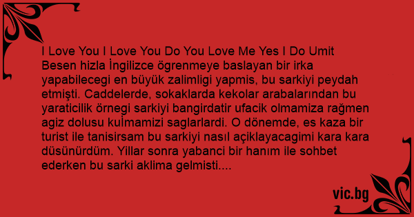 I Love You I Love You Do You Love Me Yes I Do Umit Besen hizla İngilizce ögrenmeye baslayan bir irka yapabilecegi en büyük zalimligi yapmis, bu sarkiyi peydah etmişti. Caddelerde, sokaklarda kekolar arabalarından bu yaraticilik örnegi sarkiyi bangirdatir ufacik olmamiza rağmen agiz dolusu kuİmamizi saglarlardi. O dönemde, es kaza bir turist ile tanisirsam bu sarkiyi nasıl açiklayacagimi kara kara düsünürdüm. Yillar sonra yabanci bir hanım ile sohbet ederken bu sarki aklima gelmisti.