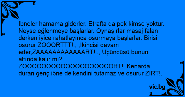 Ibneler hamama giderler. Etrafta da pek kimse yoktur. Neyse eğlenmeye başlarlar. Oynaşırlar masaj falan derken iyice rahatlayınca osurmaya başlarlar. Birisi osurur ZOOORTTT!., ;İkincisi devam eder,ZAAAAAAAAAAAART!.., Üçüncüsü bunun altında kalır mı? ZOOOOOOOOOOOOOOOOOOORT!. Kenarda duran genç ibne de kendini tutamaz ve osurur ZIRT!.
