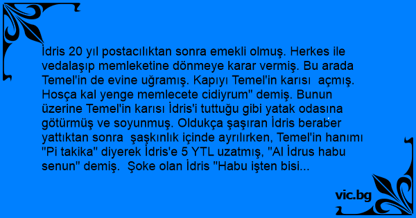 İdris 20 yıl postacılıktan sonra emekli olmuş. Herkes ile vedalaşıp memleketine dönmeye karar vermiş. Bu arada Temel'in de evine uğramış. Kapıyı Temel'in karısı açmış. Hosça kal yenge memlecete cidiyrum" demiş. Bunun üzerine Temel'in karısı İdris'i tuttuğu gibi yatak odasına götürmüş ve soyunmuş. Oldukça şaşıran İdris beraber yattıktan sonra şaşkınlık içinde ayrılırken, Temel'in hanımı "Pi takika" diyerek İdris'e 5 YTL uzatmış, "Al İdrus habu senun" demiş. Şoke olan İdris "Habu işten bisi anlamadum" demiş. Temel'in karısı da "Ben de pi şey anlamadum. Temel'e sordum, şimdi İdris bize de gelir, memlekete giderken bahşiş ister, ne yapayım dedum, o da - S*ktir, 5 YTL ver citsun!..." dedi.