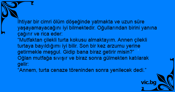 “Mutfaktan çilekli turta kokusu almaktayım. Annen çilekli turtaya bayıldığımı iyi bilir. Son bir kez arzumu yerine getirmekle meşgul. Gidip bana biraz getirir misin?”