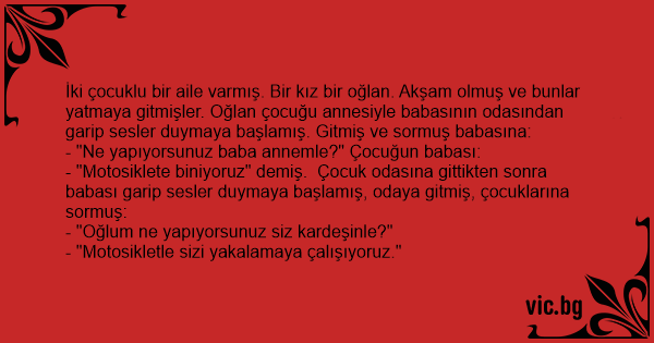 - "Motosiklete biniyoruz" demiş. Çocuk odasına gittikten sonra babası garip sesler duymaya başlamış, odaya gitmiş, çocuklarına sormuş: