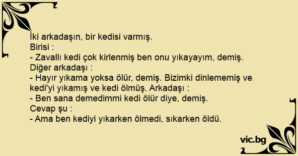 - Hayır yıkama yoksa ölür, demiş. Bizimki dinlememiş ve kedi'yi yıkamış ve kedi ölmüş. Arkadaşı :