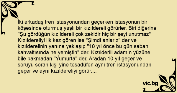 İki arkadaş tren istasyonundan geçerken istasyonun bir köşesinde oturmuş yaşlı bir kızıldereli görürler. Biri diğerine "Şu gördüğün kızıldereli çok zekidir hiç bir şeyi unutmaz"