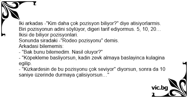 Iki arkadas -"Kim daha çok pozisyon biliyor?" diye atisiyorlarmis. Biri pozisyonun adini söylüyor, digeri tarif ediyormus. 5, 10, 20… Ikisi de biliyor pozisyonlari.