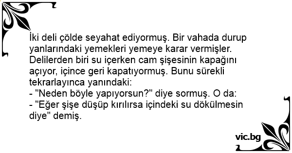 İki deli çölde seyahat ediyormuş. Bir vahada durup yanlarındaki yemekleri yemeye karar vermişler. Delilerden biri su içerken cam şişesinin kapağını açıyor, içince geri kapatıyormuş. Bunu sürekli tekrarlayınca yanındaki: