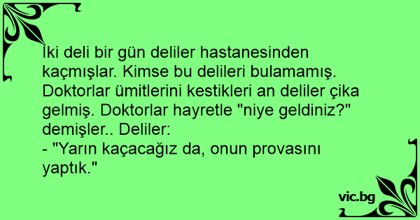 İki deli bir gün deliler hastanesinden kaçmışlar. Kimse bu delileri bulamamış. Doktorlar ümitlerini kestikleri an deliler çika gelmiş. Doktorlar hayretle "niye geldiniz?" demişler.. Deliler: