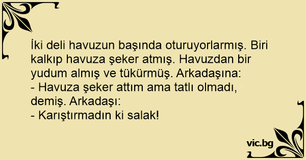 İki deli havuzun başında oturuyorlarmış. Biri kalkıp havuza şeker atmış. Havuzdan bir yudum almış ve tükürmüş. Arkadaşına: