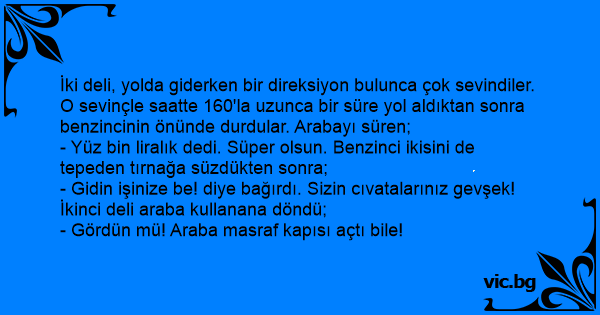 İki deli, yolda giderken bir direksiyon bulunca çok sevindiler. O sevinçle saatte 160'la uzunca bir süre yol aldıktan sonra benzincinin önünde durdular. Arabayı süren;