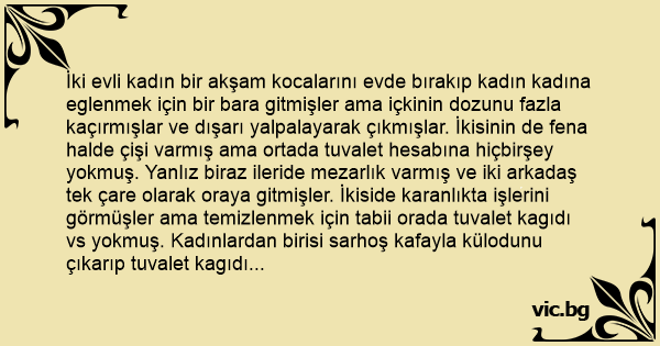 İki evli kadın bir akşam kocalarını evde bırakıp kadın kadına eglenmek için bir bara gitmişler ama içkinin dozunu fazla kaçırmışlar ve dışarı yalpalayarak çıkmışlar. İkisinin de fena halde çişi varmış ama ortada tuvalet hesabına hiçbirşey yokmuş. Yanlız biraz ileride mezarlık varmış ve iki arkadaş tek çare olarak oraya gitmişler. İkiside karanlıkta işlerini görmüşler ama temizlenmek için tabii orada tuvalet kagıdı vs yokmuş. Kadınlardan birisi sarhoş kafayla külodunu çıkarıp tuvalet kagıdı niyetine kullanmış sonra da orda biyere atmış. Diger kadın ise ”ben külodumu çıkartmam” demiş. Mezarlıktaki çelenklerden birinin üzerindeki kagıdı almış o da onunla temizlenmiş, sonra iki kadın birlikte eve dönmüşler.