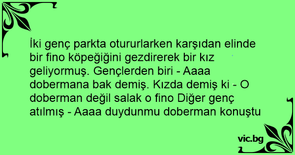 İki genç parkta otururlarken karşıdan elinde bir fino köpeğiğini gezdirerek bir kız geliyormuş. Gençlerden biri - Aaaa dobermana bak demiş. Kızda demiş ki - O doberman değil salak o fino Diğer genç atılmış - Aaaa duydunmu doberman konuştu
