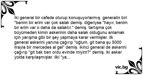 İki general bir cafede oturup konuşuyorlarmış. generalin biri "benim bir erim var çok salak demiş. diğeriyse "hayır, benim bir erim var o daha da salaktır." demiş. tartışma çok büyümeden kimin askerinin daha salak olduğunu anlamak için yarışma gibi bir şey yapmaya karar vermişler. ilk general askerini yanına çağırıp "oğlum, giт bana şu 5000 lirayla bir mercedes al gel" demiş. ikinci general de askerini çağırıp "giт bak ben ordu evinde miyim?" demiş. iki asker yolda karşılaşmışlar. ilki "ya benim general çok salak. bu günün pazar olduğunu bildiği halde beni araba aldırmaya gönderdi." demiş. ikincisiyse "benim general daha salak. yanında telefon dururken, beni ordu evine gönderdi." demiş