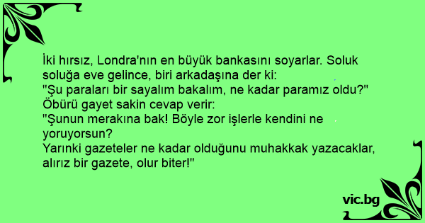 Οι διαρρήκτες Två norrmän rånade en bank. När de kommit hem tyckte den ena att de skulle räkna pengarna som de fick men den andra svarade: - Men det står ju i tidningarna imorgon???? Twee dieven hebben een bank beroofd. Als ze thuis komen, zegt een dief: "Kom we gaan ons geld tellen dat we gestolen hebben." De andere dief: "Nee dat hoeft niet, we lezen het morgen wel in de krant!"