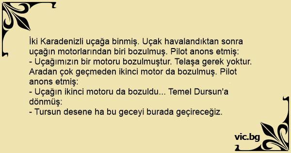 İki Karadenizli uçağa binmiş. Uçak havalandıktan sonra uçağın motorlarından biri bozulmuş. Pilot anons etmiş: