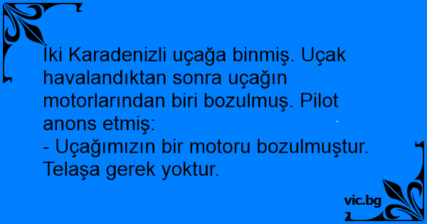 İki Karadenizli uçağa binmiş. Uçak havalandıktan sonra uçağın motorlarından biri bozulmuş. Pilot anons etmiş: