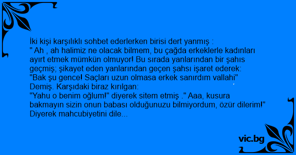 " Ah , ah halimiz ne olacak bilmem, bu çağda erkeklerle kadınları ayırt etmek mümkün olmuyor! Bu sırada yanlarından bir şahıs geçmiş; şikayet eden yanlarından geçen şahsı işaret ederek: