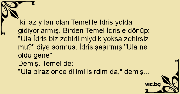 Yılan Temel, arkadaşı yılana sormuş: - Haçan, biz zehirli yilan miyuk? - Heee, n'oldu ki? - Dilimi ısırdum da...