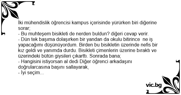 - Bu muhteşem bisikleti de nerden buldun? diğeri cevap verir.