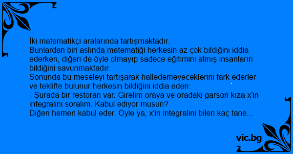 Diğeri hemen kabul eder. Öyle ya, x'in integralini bilen kaç tane garson kız vardır ki?