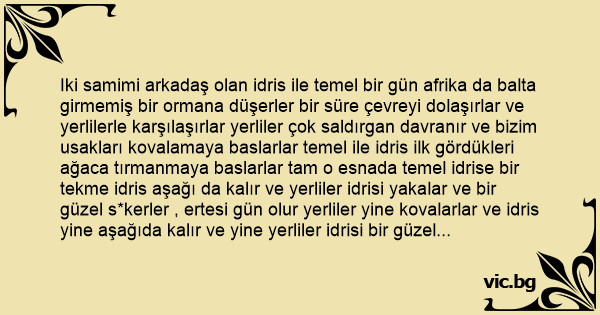 Iki samimi arkadaş olan idris ile temel bir gün afrika da balta girmemiş bir ormana düşerler bir süre çevreyi dolaşırlar ve yerlilerle karşılaşırlar yerliler çok saldırgan davranır ve bizim usakları kovalamaya baslarlar temel ile idris ilk gördükleri ağaca tırmanmaya baslarlar tam o esnada temel idrise bir tekme idris aşağı da kalır ve yerliler idrisi yakalar ve bir güzel s*kerler , ertesi gün olur yerliler yine kovalarlar ve idris yine aşağıda kalır ve yine yerliler idrisi bir güzel s*kerler. Ertesi gün yine aynı şeyler yaşanır ve idris bu durumdan hiç memnun değildir ve kendi kendine derki yarın ne olursa olsun ağaca ben çıkmalıyım. Ertesi gün olur yereliler artık dadanmışdır yine gelirler bizim uşakları kovalamaya başlarlar idris temel den önce davranıp hemen ağaca cıkar yerliler bu sefer temeli yakalarlar ve tam s*kecek iken aralarından biri derki durun hep aşağıdakini s*ktik birazda yukarıdakini s*kelim
