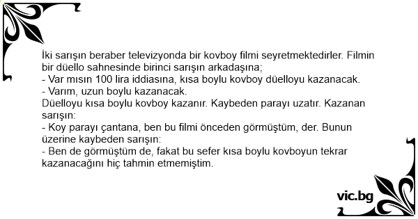 - Ben de görmüştüm de, fakat bu sefer kısa boylu kovboyun tekrar kazanacağını hiç tahmin etmemiştim.