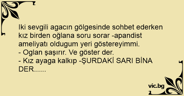Iki sevgili agacın gölgesinde sohbet ederken kız birden oğlana soru sorar -apandist ameliyatı oldugum yeri göstereyimmi.