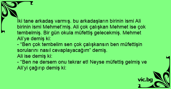 İki tane arkadaş varmış. bu arkadaşların birinin ismi Ali birinin ismi Mehmet’miş. Ali çok çalışkan Mehmet ise çok tembelmiş. Bir gün okula müfettiş gelecekmiş. Mehmet Ali’ye demiş ki: