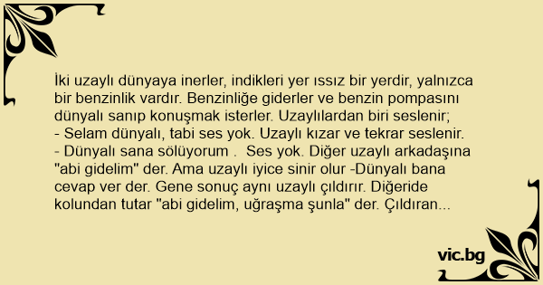 - Dünyalı sana sölüyorum . Ses yok. Diğer uzaylı arkadaşına "abi gidelim" der. Ama uzaylı iyice sinir olur -Dünyalı bana cevap ver der. Gene sonuç aynı uzaylı çıldırır. Diğeride kolundan tutar "abi gidelim, uğraşma şunla" der. Çıldıran uzaylı lazer tabancasını çeker ve benzin pompasına doğrultur. Diğeri hala ısrar eder "abi lütfen yapma gidelim" der. Sinirli uzaylı sorar;