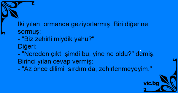 İki yılan, ormanda geziyorlarmış. Biri diğerine sormuş: