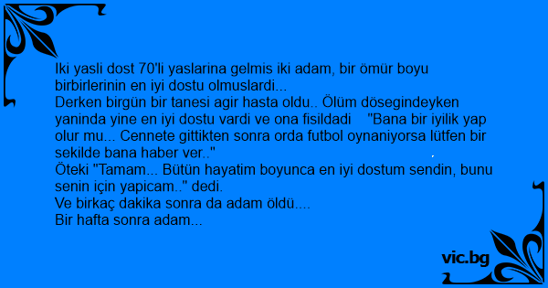 Derken birgün bir tanesi agir hasta oldu.. Ölüm dösegindeyken yaninda yine en iyi dostu vardi ve ona fisildadi "Bana bir iyilik yap olur mu... Cennete gittikten sonra orda futbol oynaniyorsa lütfen bir sekilde bana haber ver.."