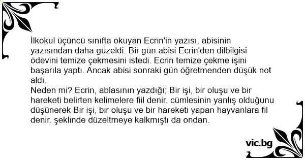 Neden mi? Ecrin, ablasının yazdığı; Bir işi, bir oluşu ve bir hareketi belirten kelimelere fiil denir. cümlesinin yanlış olduğunu düşünerek Bir işi, bir oluşu ve bir hareketi yapan hayvanlara fil denir. şeklinde düzeltmeye kalkmıştı da ondan.