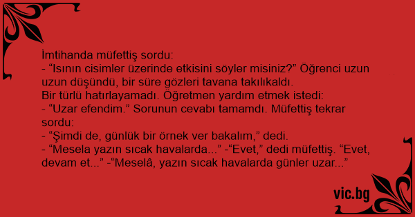- “Isının cisimler üzerinde etkisini söyler misiniz?” Öğrenci uzun uzun düşündü, bir süre gözleri tavana takılıkaldı.