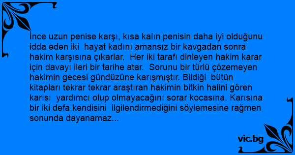 İnce uzun penise karşı, kısa kalın penisin daha iyi olduğunu idda eden iki hayat kadını amansız bir kavgadan sonra hakim karşısına çıkarlar. Her iki tarafı dinleyen hakim karar için davayı ileri bir tarihe atar. Sorunu bir türlü çözemeyen hakimin gecesi gündüzüne karışmıştır. Bildiği bütün kitapları tekrar tekrar araştıran hakimin bitkin halini gören karısı yardımcı olup olmayacağını sorar kocasına. Karısına bir iki defa kendisini ilgilendirmediğini söylemesine rağmen sonunda dayanamaz ve içinde olduğu problemi karısıyla paylaşır. Karısı çok sakin bir edayla kocacım kafanı yorduğun şeye bak ; Ne ince uzun olanı, ne de kalın kısa olanı ; önemli olan içinde çok kalanı der. Hakimin yüz ifadesinde artık rahatlık belirtileri görünmüştür. Dava günü geldiğinde taraflar tekrar dinlenir, yine birsürü gürültü kopar, hakim bağrarak, yeter artık ne ince uzun olanı, ne de kalın kısa olanı ; önemli olan içinde çok kalanı der. Dava düşer, hakim mutludur ancak hanımlardan biri çıkışta yanına gelir, hakimi tebrik ederek bu cevabı hangi orospudan öğrendiğini sorar!!!!!!!!!!