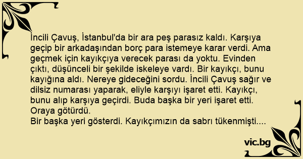 İncili Çavuş, İstanbul'da bir ara peş parasız kaldı. Karşıya geçip bir arkadaşından borç para istemeye karar verdi. Ama geçmek için kayıkçıya verecek parası da yoktu. Evinden çıktı, düşünceli bir şekilde iskeleye vardı. Bir kayıkçı, bunu kayığına aldı. Nereye gideceğini sordu. İncili Çavuş sağır ve dilsiz numarası yaparak, eliyle karşıyı işaret etti. Kayıkçı, bunu alıp karşıya geçirdi. Buda başka bir yeri işaret etti. Oraya götürdü.